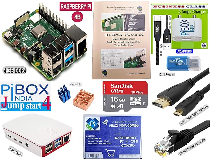 PiBOX India Raspberry Pi 4 4GB Jump Start4 Combo kit 4413W with Pi4 4GB, Pi4 Official case,16GB Noobs Card, BIS 3 Amps Charger, Copper Heatsink, HDMI Cable, Ethernet Cable and Adapters - 2019 Model