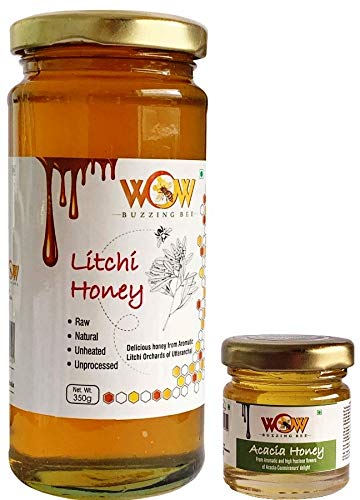 WOW BUZZING BEE - Raw Natural Unprocessed Raw Litchi Forest Flower Honey 350 GMS & Raw Acacia Flower Honey 55 GMS Combo Pack