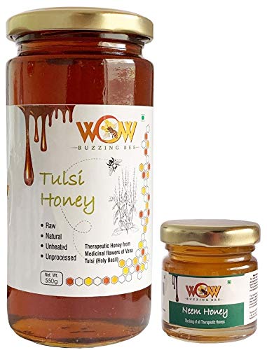 WOW BUZZING BEE - Raw Natural Unprocessed Raw Tulsi Forest Flower Honey 550 GMS & Get Free Another Flavour Raw Flower Honey 55 GMS Combo Pack