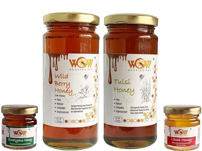 WOW BUZZING BEE - Raw Natural Unprocessed Tulsi Forest Flower Honey & Wild Berry -Sidr Honey (350 GMS X 2 ) + Free 2 Varieties Honey (55 GMS x 2)
