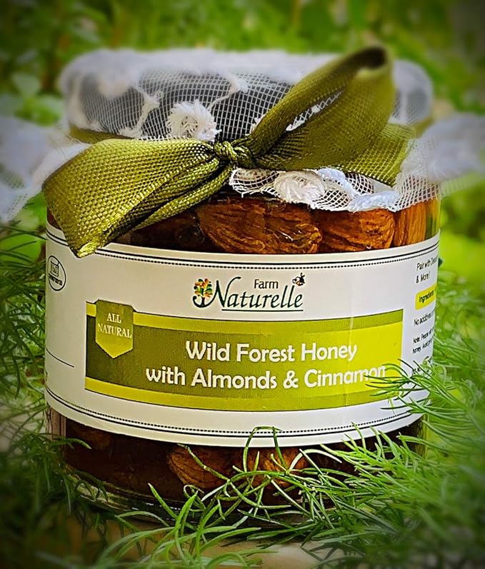 Farm Naturelle (Farm Natural Produce) Cinnamon Infused Raw Natural Forest Honey and Big Delicious Almonds (Badaam) -250g Health Gift Item Pack