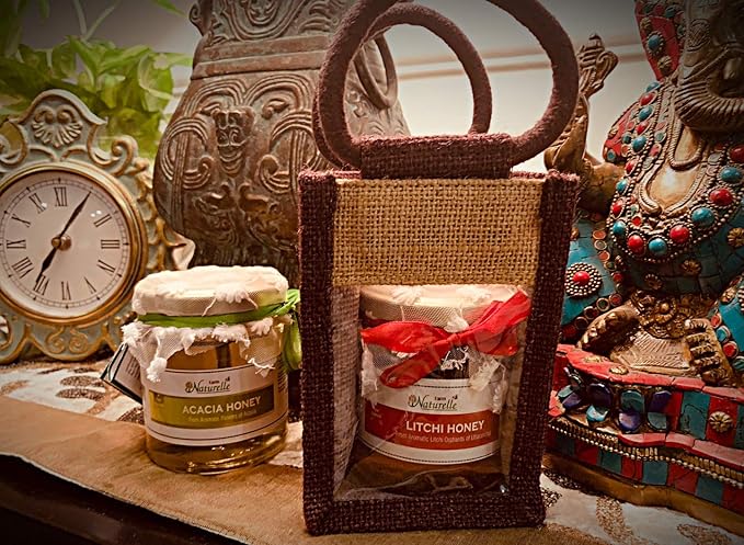 Farm Naturelle -Aesthetically Designed Jute Gift Bag with Pure Raw Natural Unheated Unprocessed Litchi Flower Honey-250 GMS- Diwali Health Gift Pack